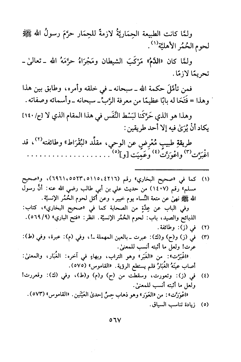 ولمَّا كانت الطبيعة الحِمَاريَّةُ لازمةً للحِمَار حرَّمَ رسولُ الله - صلى الله عليه وسلم - لحوم الحُمُر الأهليَّة (¬1).