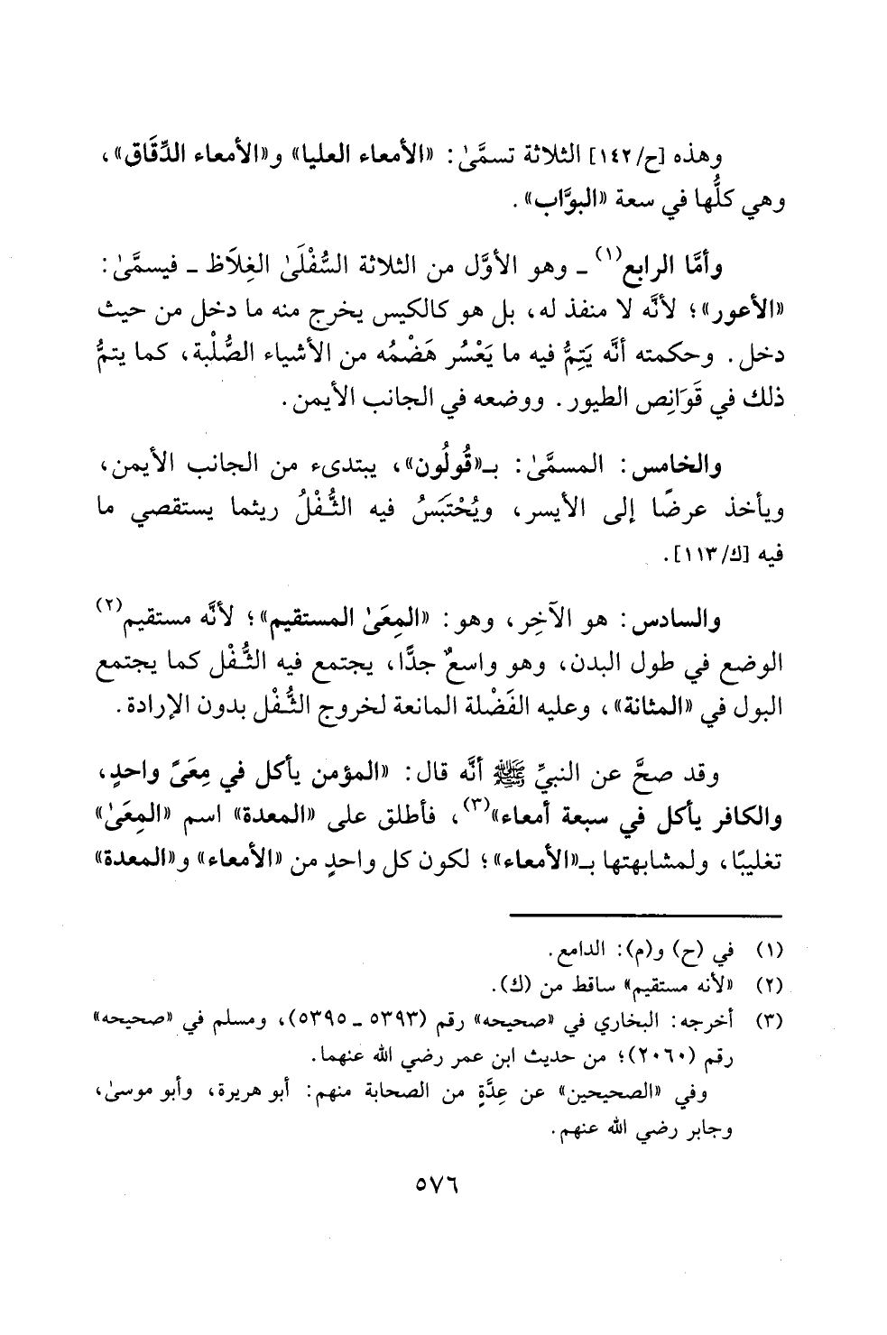 وقد صحَّ عن النبيِّ - صلى الله عليه وسلم- أنَّه قال: "المؤمن يأكل في مِعَىً واحدٍ، والكافر يأكل في سبعة أمعاء" (¬3)، فأطلق على "المعدة" اسم "المِعَى" تغليبًا، ولمشابهتها بـ "الأمعاء"؛ لكون كل واحدٍ من "الأمعاء" و"المعدة"