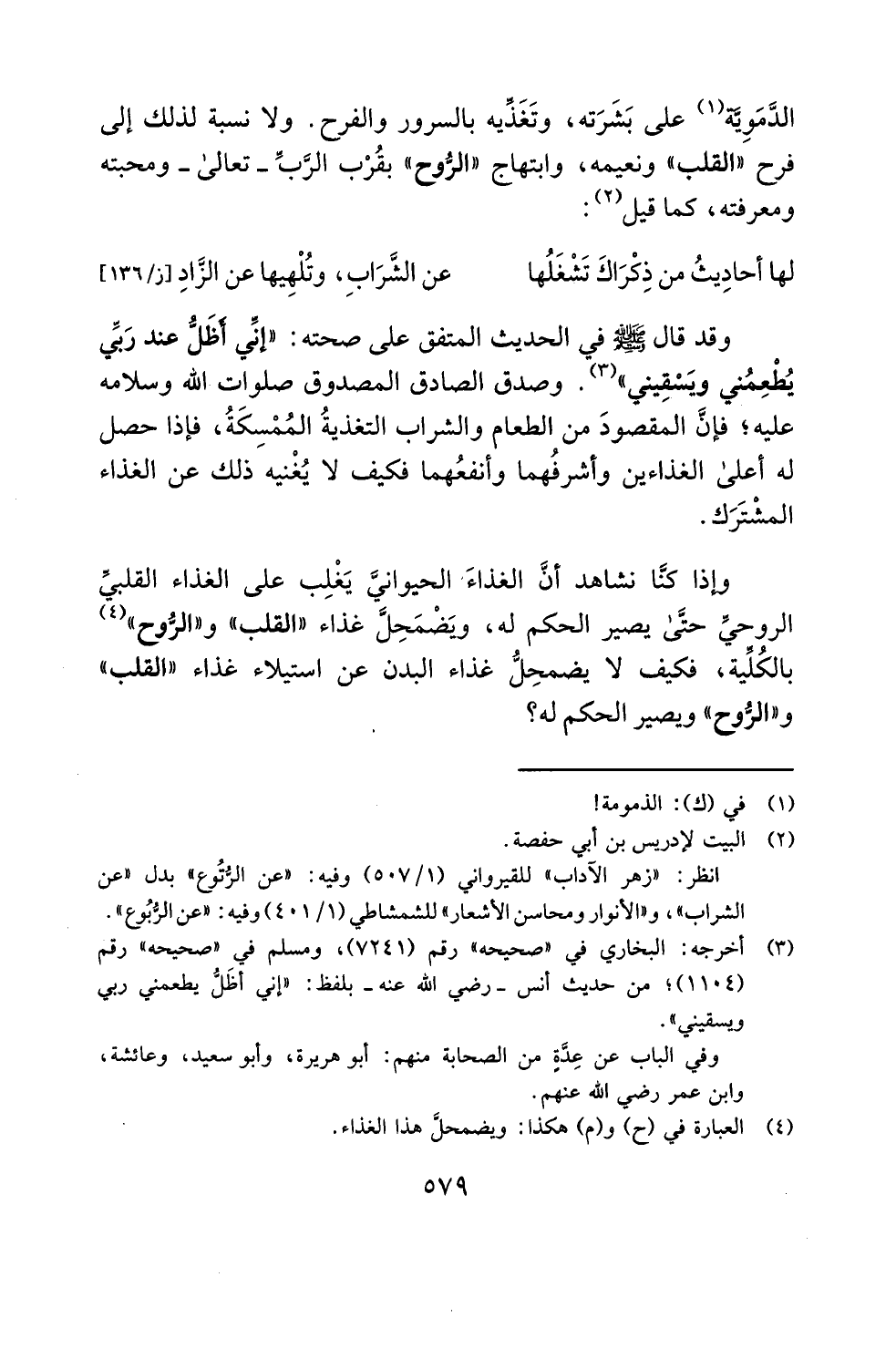 وإذا كنَّا نشاهد أنَّ الغذاء الحيوانيَّ يَغْلِب على الغذاء القلبيِّ الروحي حتَّى يصير الحكم له، ويَضْمَحِل غذاء "القلب" و"الرُّوح" (¬4) بالكُليَّة، فكيف لا يضمحِلُّ غذاء البدن عن استيلاء غذاء "القلب" و"الرُّوح" ويصير الحكم له؟