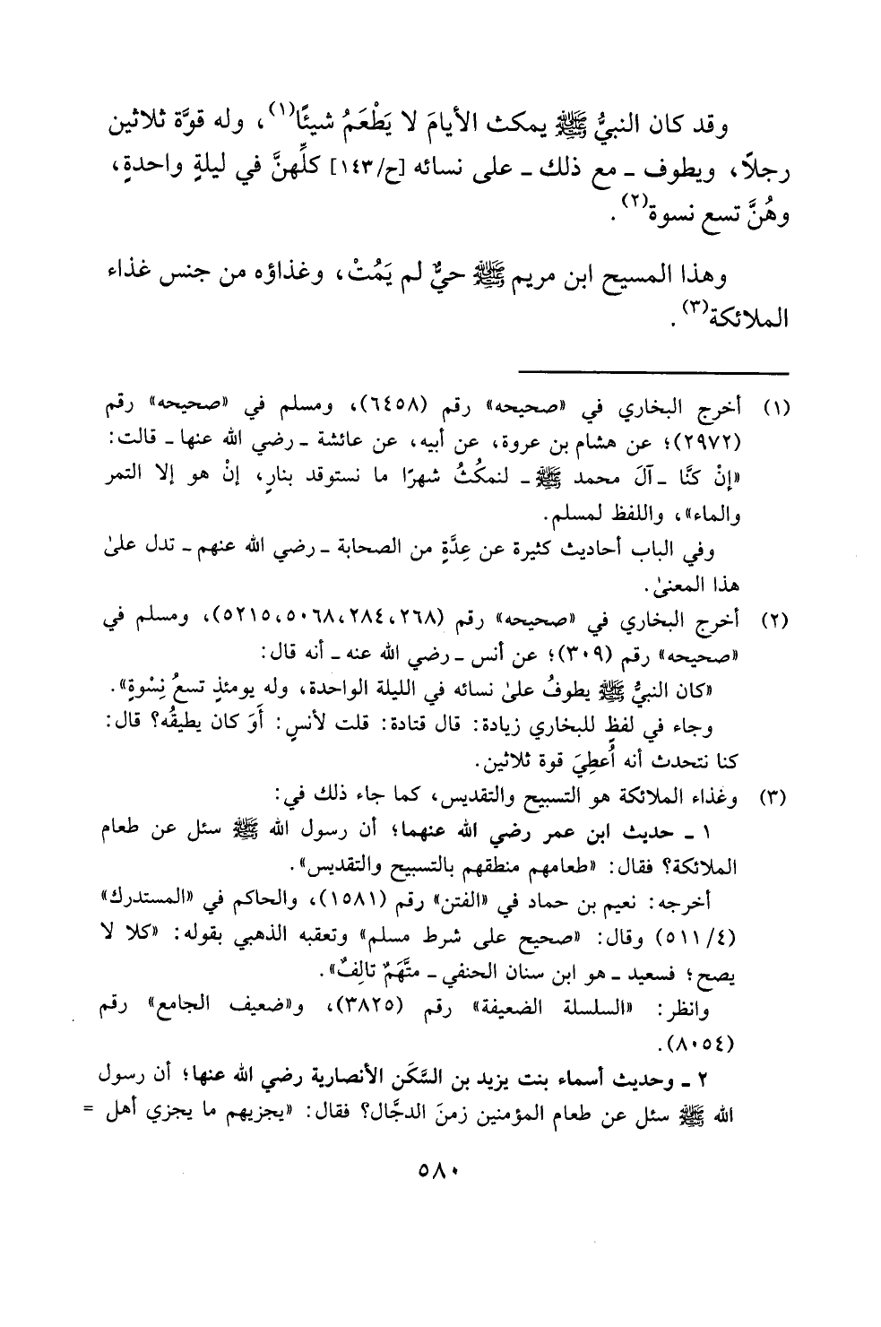 "كان النبيُّ - صلى الله عليه وسلم - يطوفُ على نسائه في الليلة الواحدة، وله يومئذٍ تسعُ نِسْوةٍ". وجاء في لفظٍ للبخاري زيادة: قال قتادة: قلت لأنسِ: أَوَ كان يطيقُه؟ قال: كنا نتحدث أنه أُعطِيَ قوة ثلاثين.