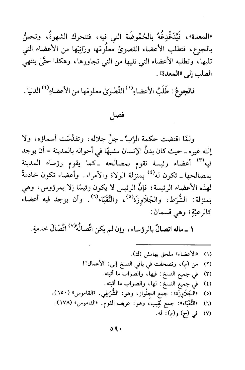 ولمَّا اقتضت حكمة الرَّبِّ -جلَّ جلاله، وتقدَّسَت أسماؤه، ولا إله غيره- حيث كان بدنُ الإنسان مشبهًا في أحواله بالمدينة = أن يوجد فيه (¬3) أعضاء رئيسة تقوم بمصالحه -كما يقوم رؤساء المدينة بمصالحها- تكون له (¬4) بمنزلة الولاة والأمراء. وأعضاء تكون خادمةً لهذه الأعضاء الرئيسة؛ فإنَّ الرئيس لا يكون رئيسًا إلا بمرؤوس، وهي بمنزلة: الشُّرَط، والجَلاَوِزَة (¬5)، والنُّقَبَاء (¬6). وأن يوجد فيه أعضاء كالرعيَّةِ؛ وهي قسمان:
