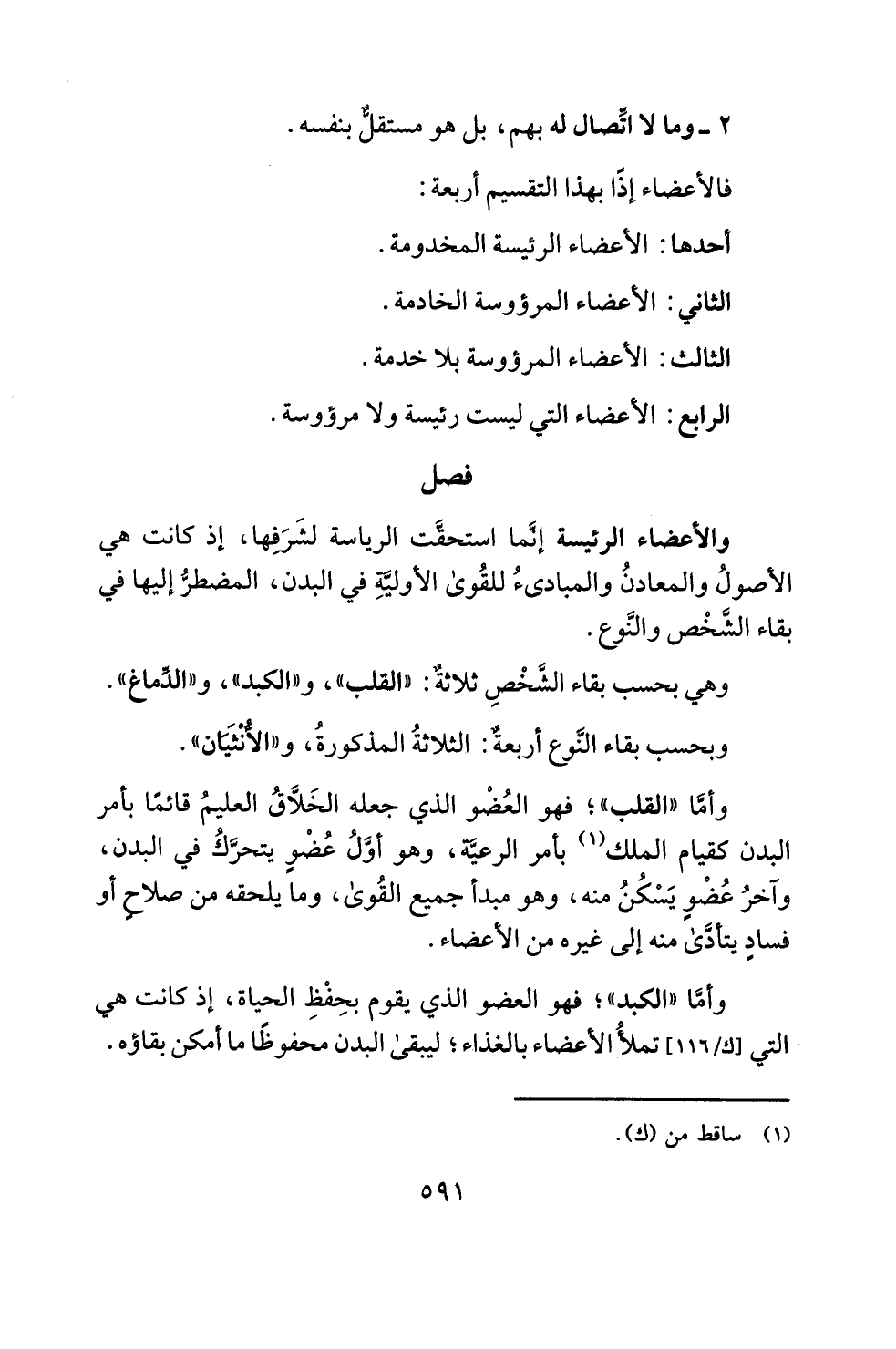 وأمَّا "الكبد"؛ فهو العضو الذي يقوم بحِفْظِ الحياة، إذ كانت هي التي [ك/116] تملأُ الأعضاء بالغذاء؛ ليبقى البدن محفوظًا ما أمكن بقاؤه.