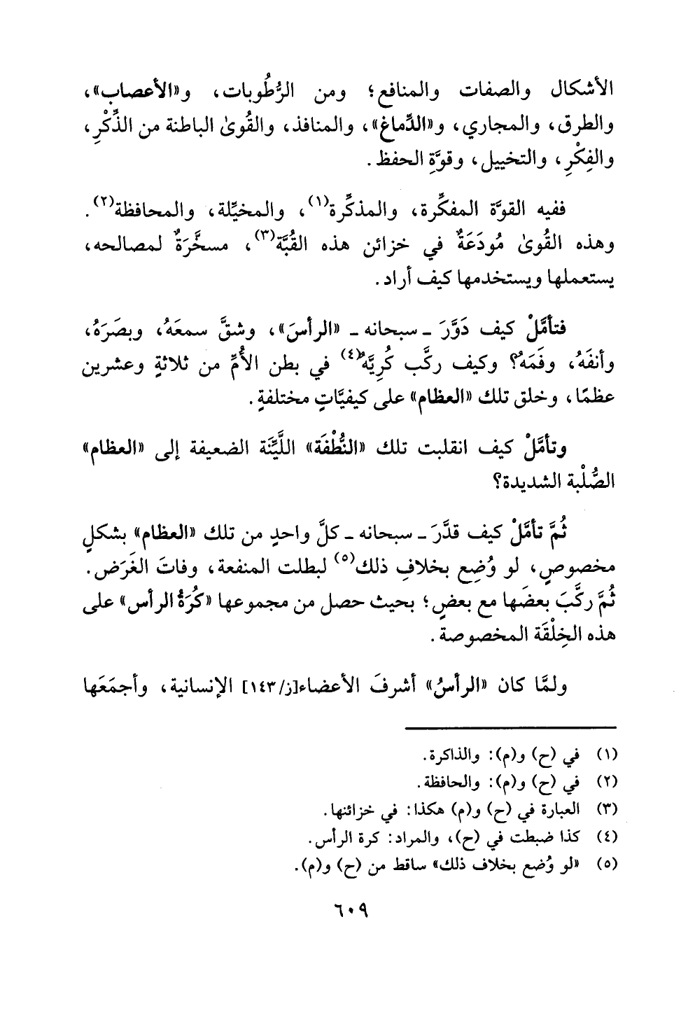 ثُمَّ تأمَّلْ كيف قدَّرَ -سبحانه- كل واحدٍ من تلك "العظام" بشكلٍ مخصوص، لو وُضِع بخلافِ ذلك (¬5) لبطلت المنفعة، وفاتَ الغَرَض. ثُمَّ ركَّبَ بعضَها مع بعضٍ؛ بحيث حصل من مجموعها "كُرَةُ الرأس" على هذه الخِلْقَة المخصوصة.