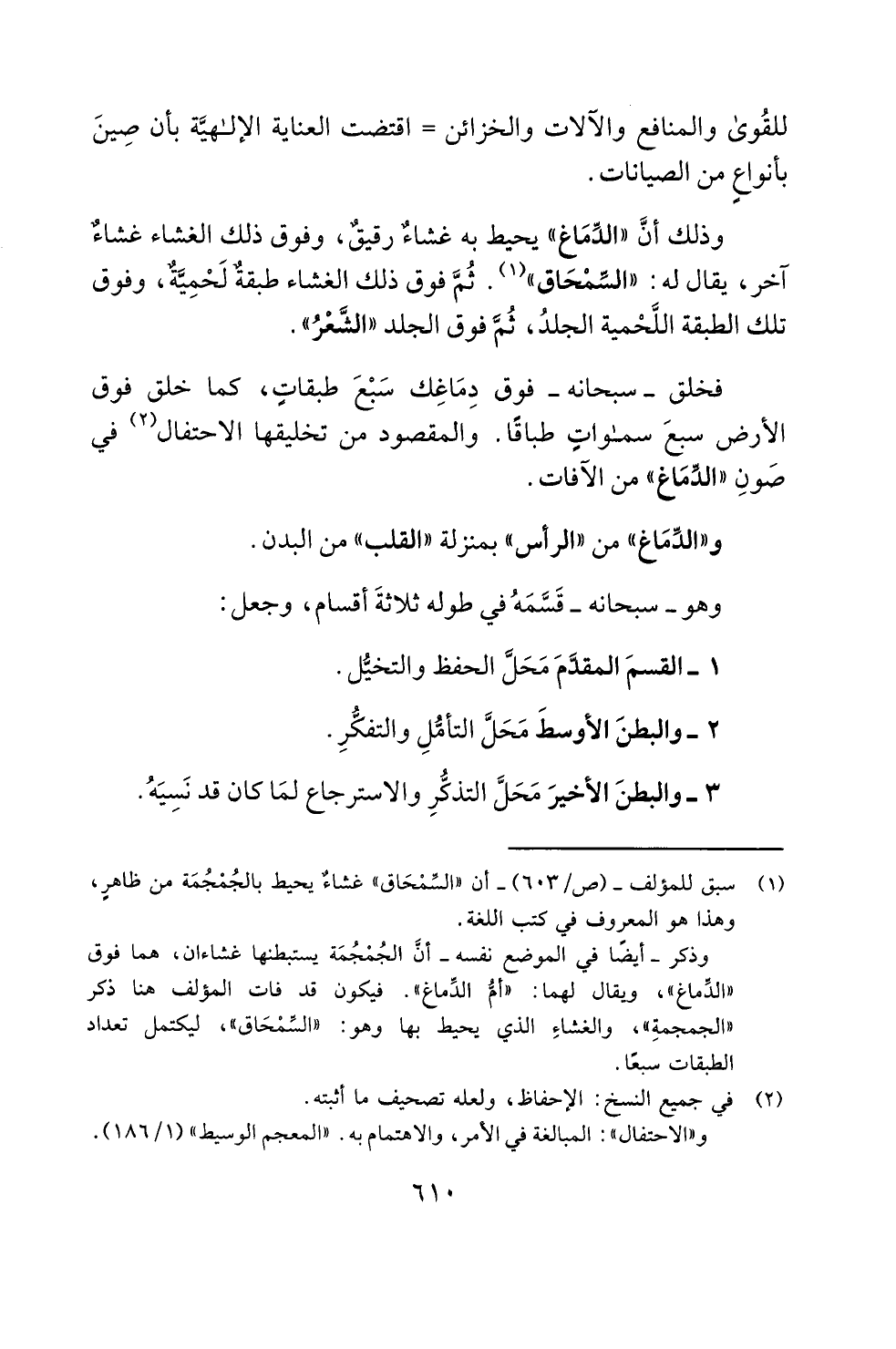 وذلك أنَّ "الدِّمَاغ" يحيط به غشاءٌ رقيقٌ، وفوق ذلك الغشاء غشاءٌ آخر، يقال له: "السِّمْحَاق" (¬1). ثُمَّ فوق ذلك الغشاء طبقةٌ لَحْمِيَّةٌ، وفوق تلك الطبقة اللَّحْمية الجلدُ، ثُمَّ فوق الجلد "الشَّعْرُ".