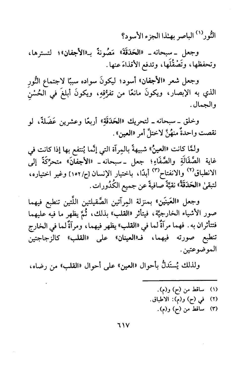ولمَّا كانت "العينُ" شبيهةً بالمِرآة التي إنَّما يُنتفعِ بها إذا كانت في غاية الصَّقَالَةِ والصَّفَاءِ؛ جعل -سبحانه- "الأجفان" متحرِّكَةً إلى الانطباق (¬2) والانفتاح (¬3) أبدًا، باختيار الإنسان [ح/ 152] وغير اختياره، لتبقى "الحَدَقَةُ" نقيَّةً صافيةً عن جميع الكُدُورات.