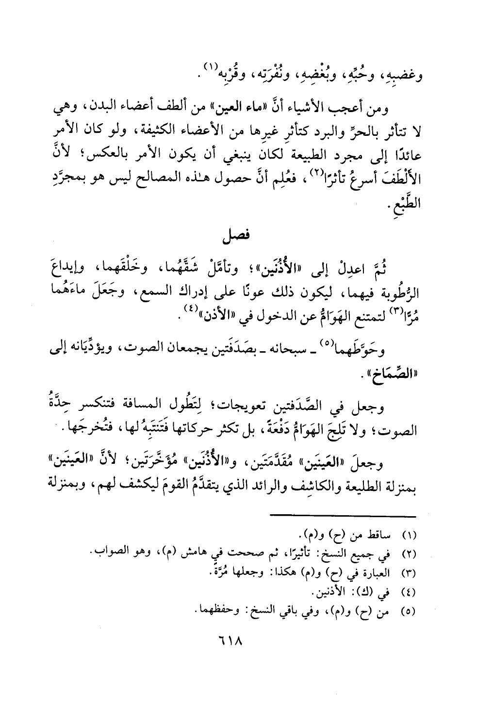 ومن أعجب الأشياء أنَّ "ماء العين" من ألطف أعضاء البدن، وهي لا تتأثر بالحرِّ والبرد كتأثرِ غيرِها من الأعضاء الكثيفة، ولو كان الأمر عائدًا إلى مجرد الطبيعة لكان ينبغي أن يكون الأمر بالعكس؛ لأنَّ الألْطَفَ أسرعُ تأثرًا (¬2)، فعُلِم أنَّ حصول هذه المصالح ليس هو بمجرَّدِ الطَّبْعِ.