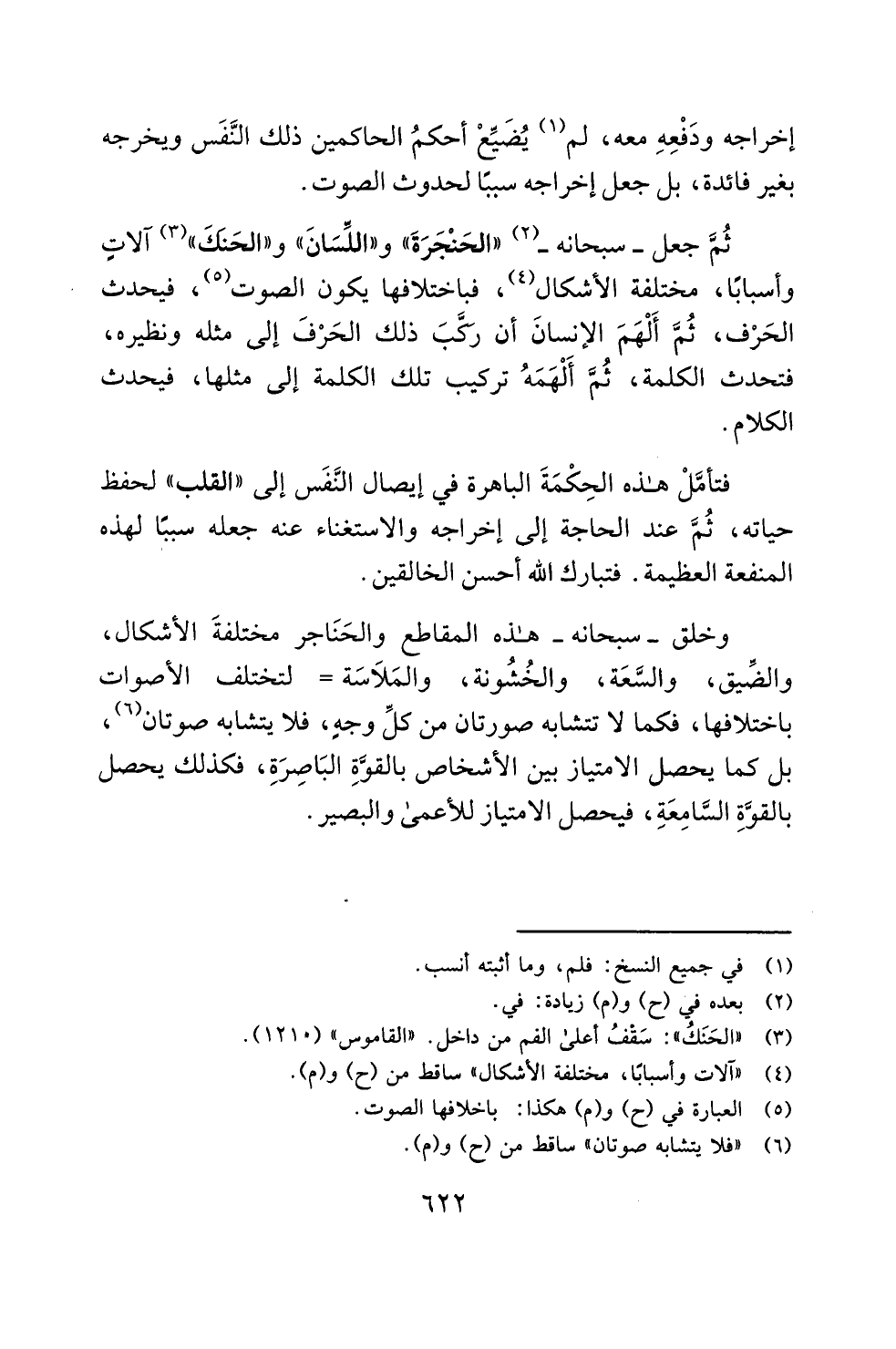 ثُمَّ جعل-سبحانه- (¬2) "الحَنْجَرَةَ" و"اللَّسَانَ" و"الحَنَكَ" (¬3) آلاتِ وأسبابًا، مختلفة الأشكال (¬4)، فباختلافها يكون الصوت (¬5)، فيحدث الحَرْف، ثُمَّ أَلْهَمَ الإنسانَ أن رَكَّبَ ذلك الحَرْفَ إلى مثله ونظيره، فتحدث الكلمة، ثُمَّ أَلْهَمَهُ تركيب تلك الكلمة إلى مثلها، فيحدث الكلام.