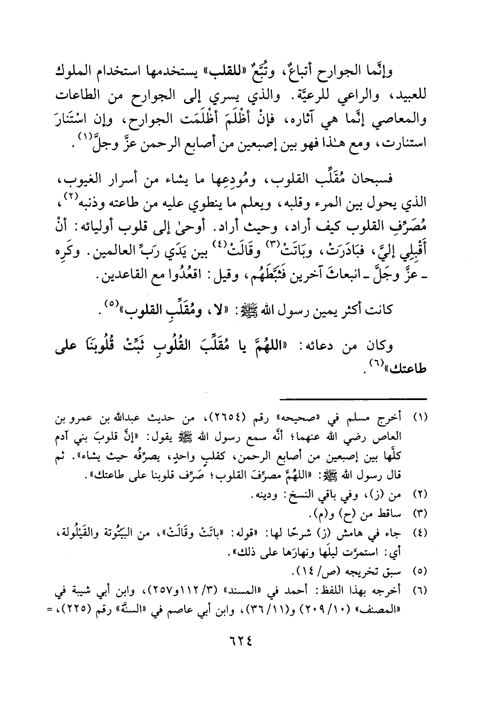 (¬1) أخرج مسلم في "صحيحه" رقم (2654)، من حديث عبد الله بن عمرو بن العاص -رضي الله عنهما-؛ أنَّه سمع رسول الله - صلى الله عليه وسلم - يقول: "إنَّ قلوبَ بني آدم كلِّها بين إصبعين من أصابع الرحمن، كقلبِ واحدٍ، يصرِّفُه حيث يشاء". ثم قال رسول الله - صلى الله عليه وسلم -: "اللهُمَّ مصرِّفَ القلوب؛ صَرِّف قلوبنا على طاعتك".