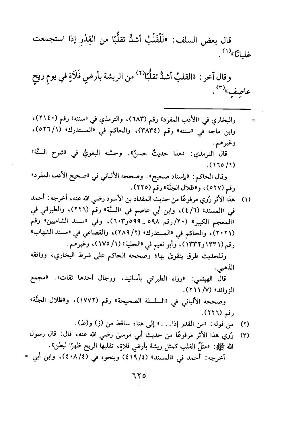 (¬3) رُوي هذا الأثر مرفوعًا من حديث أبي موسى -رضي الله عنه-، قال: قال رسول الله - صلى الله عليه وسلم -: "مثلُ القلب كمثل ريشة بأرضٍ فلاةٍ، تقلبها الريح ظهرًا لبطن".
