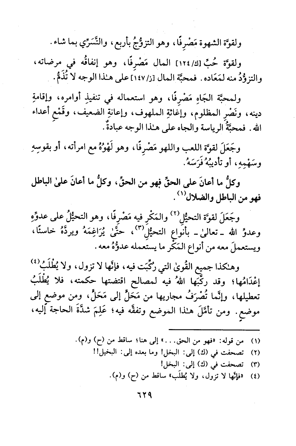 وهكذا جميع القُوى التي رُكِّبَت فيه، فإنَّها لا تزول، ولا يُطْلَبُ (¬4) إعْدَامُها؛ وقد ركَبَها اللهُ فيه لمصالح اقتضتها حكمته، فلا يُطْلَبُ تعطيلها، وإنَّما تُصْرَفُ مجاريها من مَحَلٍّ إلى مَحَلٍّ، ومن موضع إلى موضعٍ. ومن تأمَّلَ هذا الموضع وتفقَّه فيه؛ عَلِمَ شدَّةَ الحاجة إليه،
