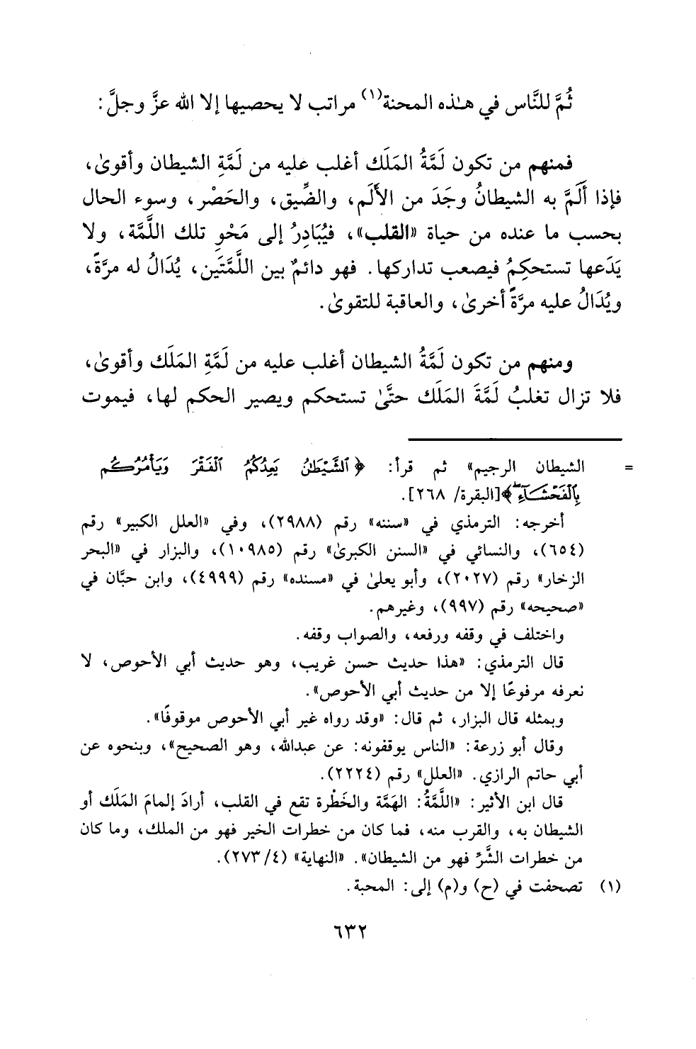 ومنهم من تكون لَمَّةُ الشيطان أغلب عليه من لَمَّةِ المَلَك وأقوى، فلا تزال تغلبُ لَمَّةَ المَلَك حتَّى تستحكم ويصير الحكم لها، فيموت