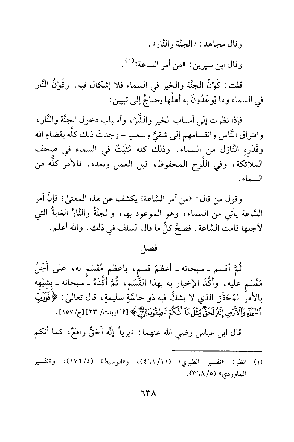 ثُمَّ أقسم -سبحانه- أعظمَ قسمٍ، بأعظم مُقْسَمٍ به، على أَجَل مُقْسَمٍ عليه، وأكَّدَ الإخبار به بهذا القَسَم، ثُمَّ أكَّدَهُ -سبحانه- بشِبْهِه بالأمر المُحَقَّق الذي لا يشكُّ فيه ذو حاسَّةٍ سليمةٍ، قال تعالى: {فَوَرَبِّ السَّمَاءِ وَالْأَرْضِ إِنَّهُ لَحَقٌّ مِثْلَ مَا أَنَّكُمْ تَنْطِقُونَ (23)} [الذاريات: 23] [ح/ 157].