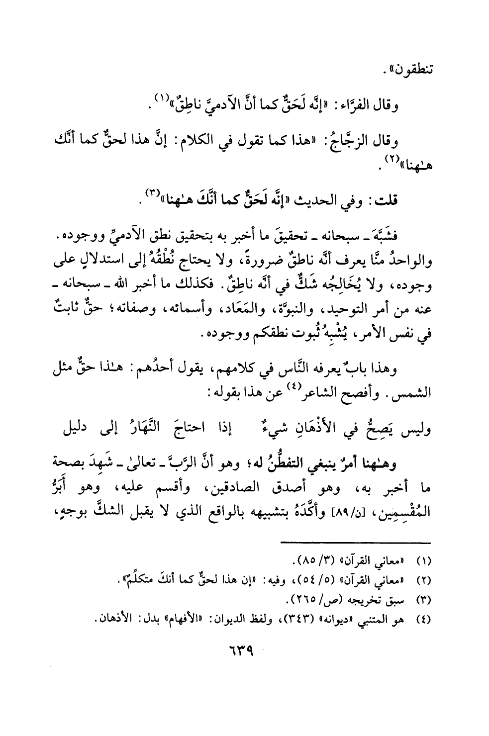 (¬4) هو المتنبي "ديوانه" (343)، ولفظ الديوان: "الأفهام" بدل: الأذهان.