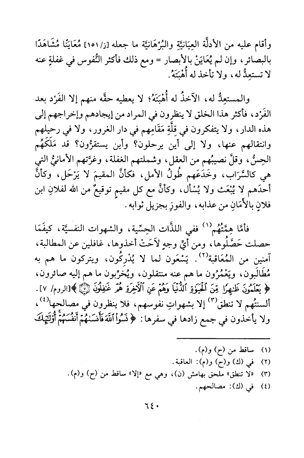 والمستعِدُّ له، الآخذُ له أُهْبَتَهُ، لا يعطيه حقَّه منهم إلا الفَرْد بعد الفَرْد، فأكثر هذا الخلق لا ينظرون في المراد من إيجادهم وإخراجهم إلى هذه الدار، ولا يتفكرون في قِلَّةِ مَقَامِهم في دار الغرور، ولا في رحيلهم وانتقالهم عنها، ولا إلى أين يرحلون؟ وأين يستقرُّون؟ قد مَلَكَهُم الحِسُّ، وقلَّ نصيبُهم من العقل، وشملتهم الغفلة، وغرَّتهم الأمانيُّ التي هي كالسَّرَاب، وخَدَعَهم طُولُ الأمل، فكأنَّ المقيمَ لا يَرْحَل، وكأنَّ أحدَهم لا يُبْعَث ولا يُسْأل، وكأنَّ مع كل مقيمٍ توقيعٌ من الله لفلانِ ابن فلانٍ بالأَمَانِ من عذابه، والفوزِ بجزيل ثوابه.