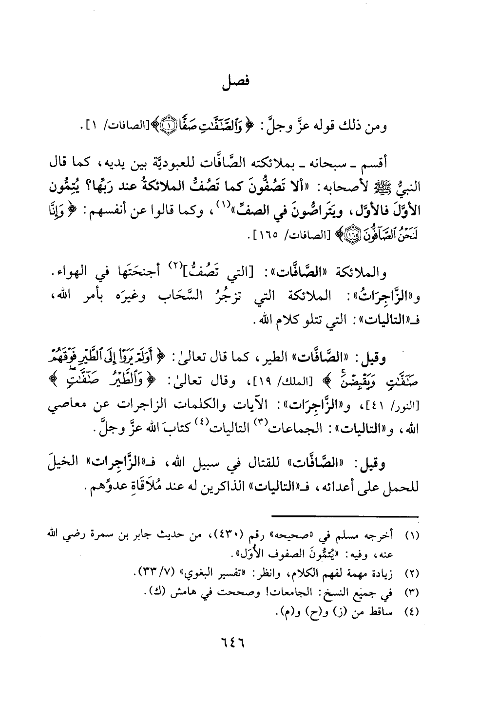 والملائكة "الصَّافَّات": [التي تَصُفُّ]، (¬2) أجنحَتَها في الهواء. و"الزَّاجِرَاتُ ": الملائكة التي تزجُرُ السَّحَاب وغيرَه بأمر الله، فـ "التاليات": التي تتلو كلام الله.