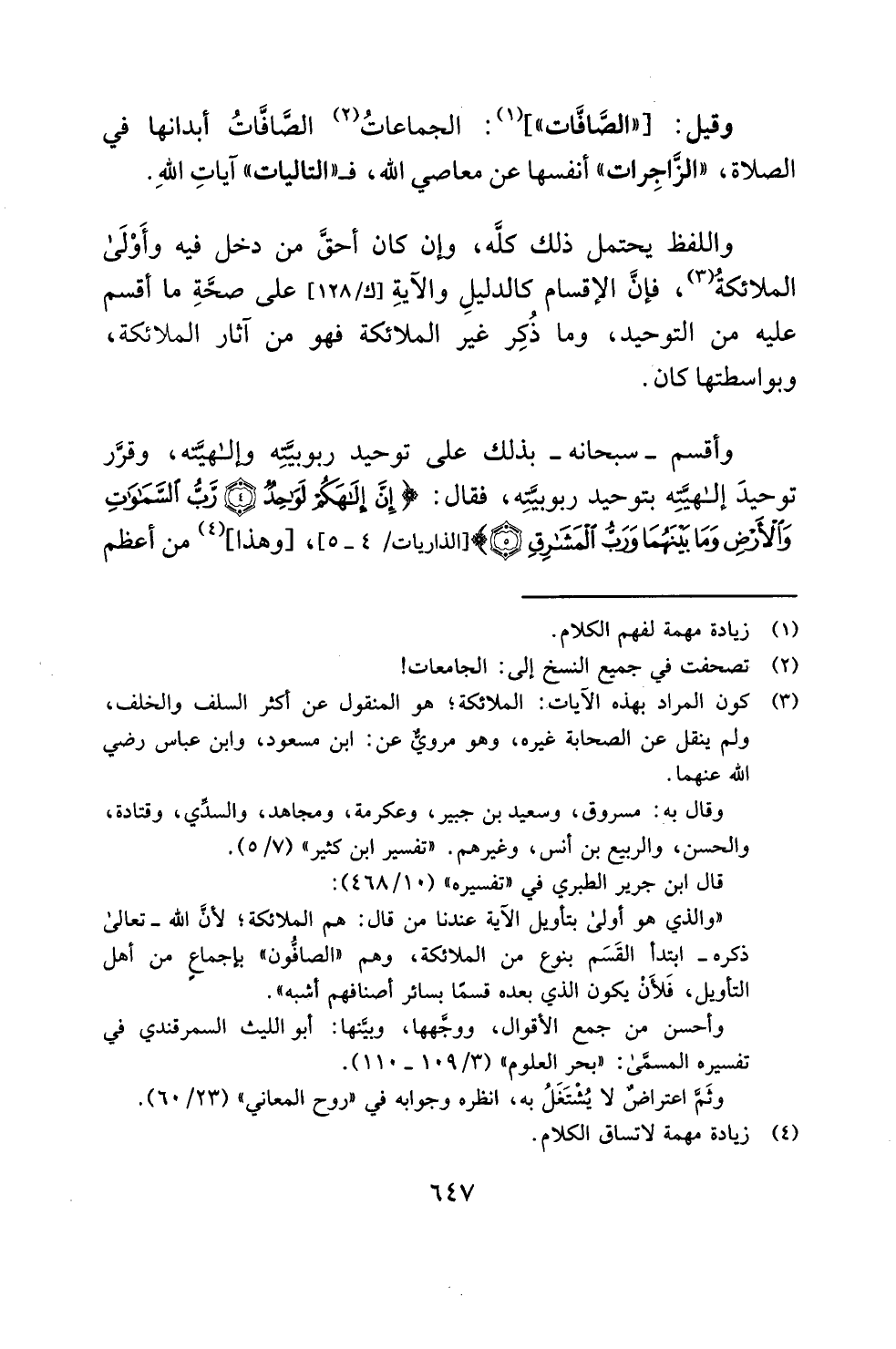 "والذي هو أولى بتأويل الآية عندنا من قال: هم الملائكة؛ لأنَّ الله -تعالى ذكره- ابتدأ القَسَم بنوع من الملائكة، وهم "الصافُّون" بإجماعٍ من أهل التأويل، فَلأَنْ يكون الذي بعده قسمًا بسائر أصنافهم أشبه".