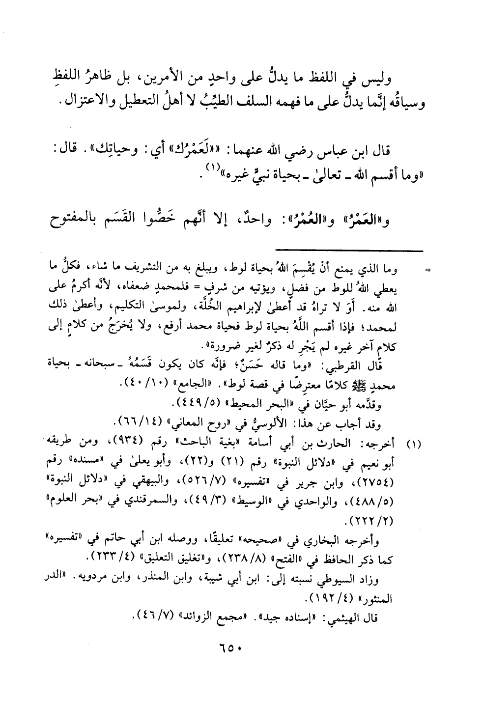 قال ابن عباس -رضي الله عنهما-: ""لَعَمْرُك" أي: وحياتِك". قال: "وما أقسم الله -تعالى- بحياة نبيٍّ غيره" (¬1).