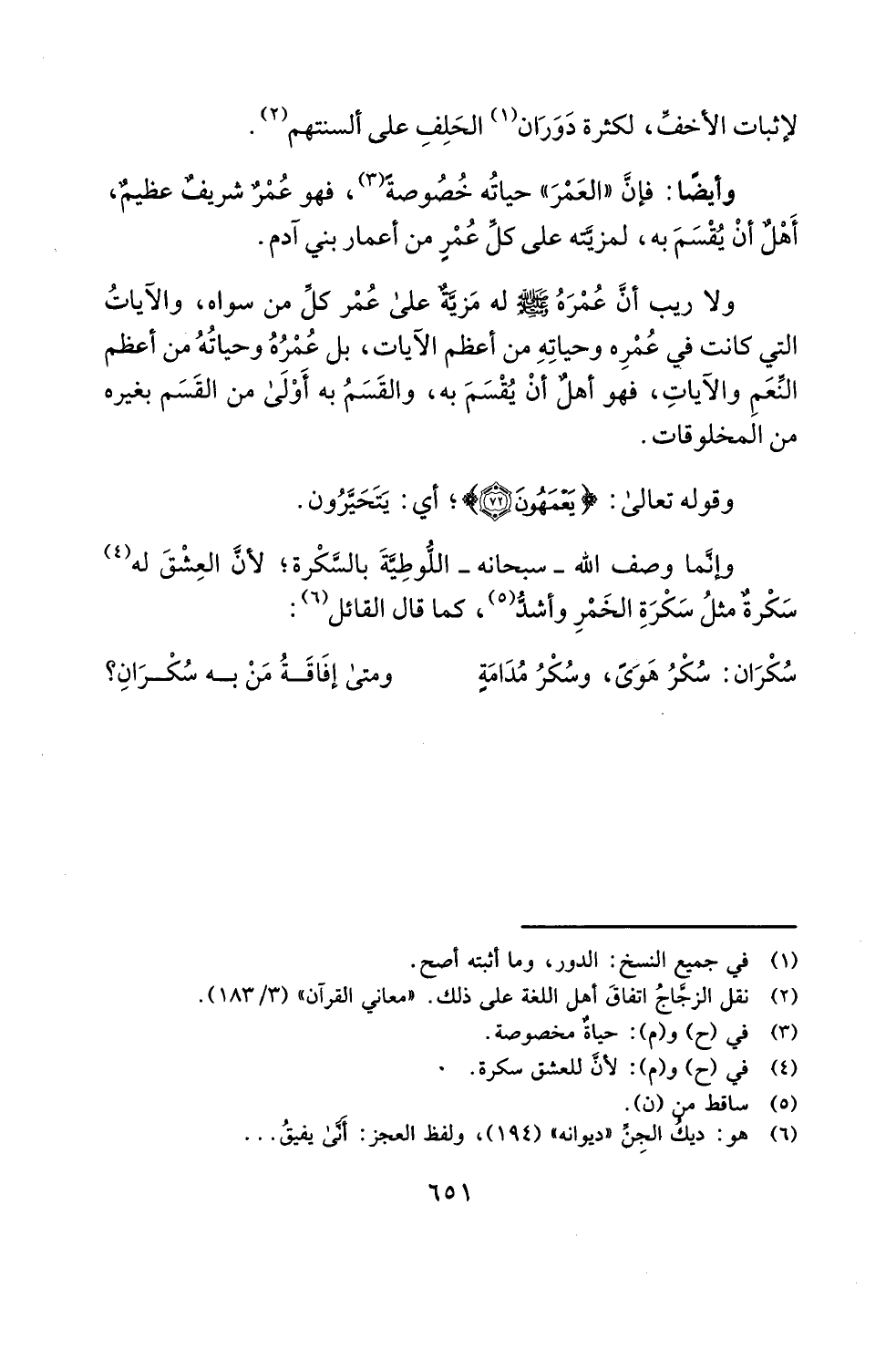 ولا ريب أنَّ عُمْرَهُ - صلى الله عليه وسلم - له مَزيَّةٌ على عُمْر كلِّ من سواه، والآياتُ التي كانت في عُمْرِه وحياتِهِ من أعظم الآيات، بل عُمْرُهُ وحياتُهُ من أعظم النِّعَمِ والآياتِ، فهو أهلٌ أنْ يُقْسَمَ به، والقَسَمُ به أَوْلَى من القَسَم بغيره من المخلوقات.