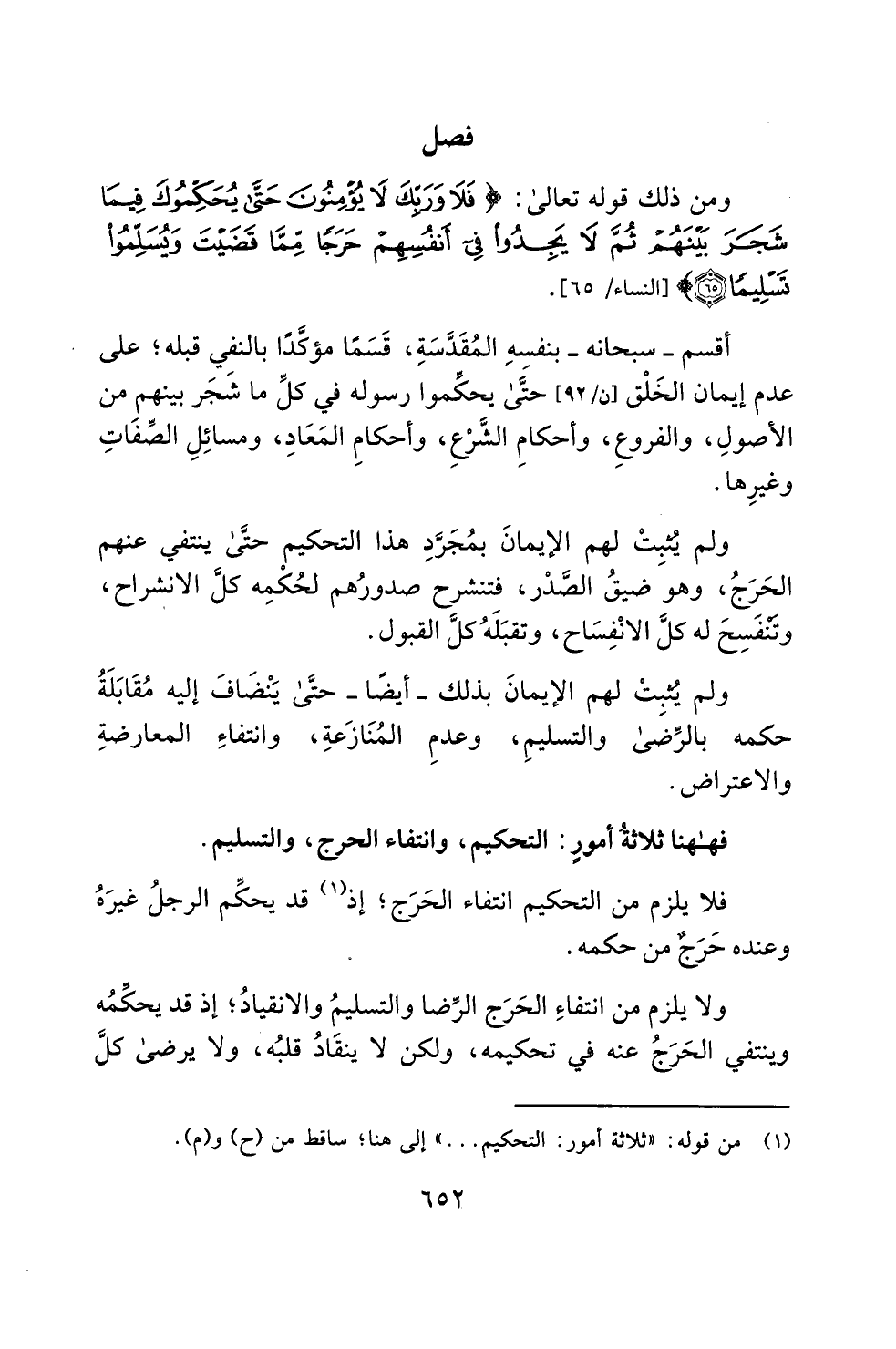 فههنا ثلاثةُ أمورٍ: التحكيم، وانتفاء الحرج، والتسليم.