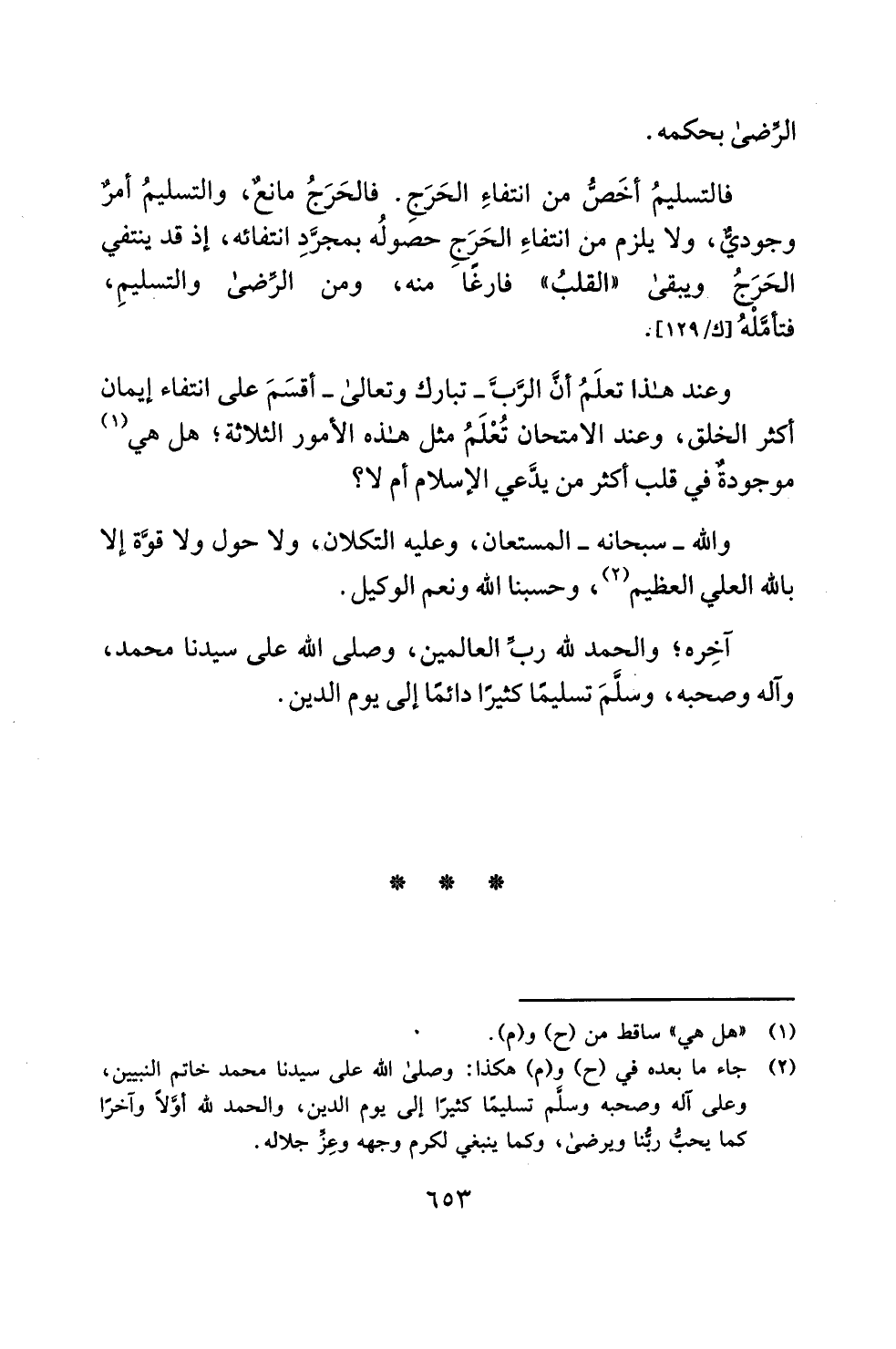 فالتسليمُ أخَصُّ من انتفاءِ الحَرَجِ. فالحَرَجُ مانعٌ، والتسليمُ أمرٌ وجوديٌّ، ولا يلزم من انتفاءِ الحَرَجِ حصولُه بمجرَّدِ انتفائه، إذ قد ينتفي الحَرَجُ ويبقى "القلبُ" فارغًا منه، ومن الرِّضى والتسليمِ، فتأمَّلْهُ [ك/ 129]: