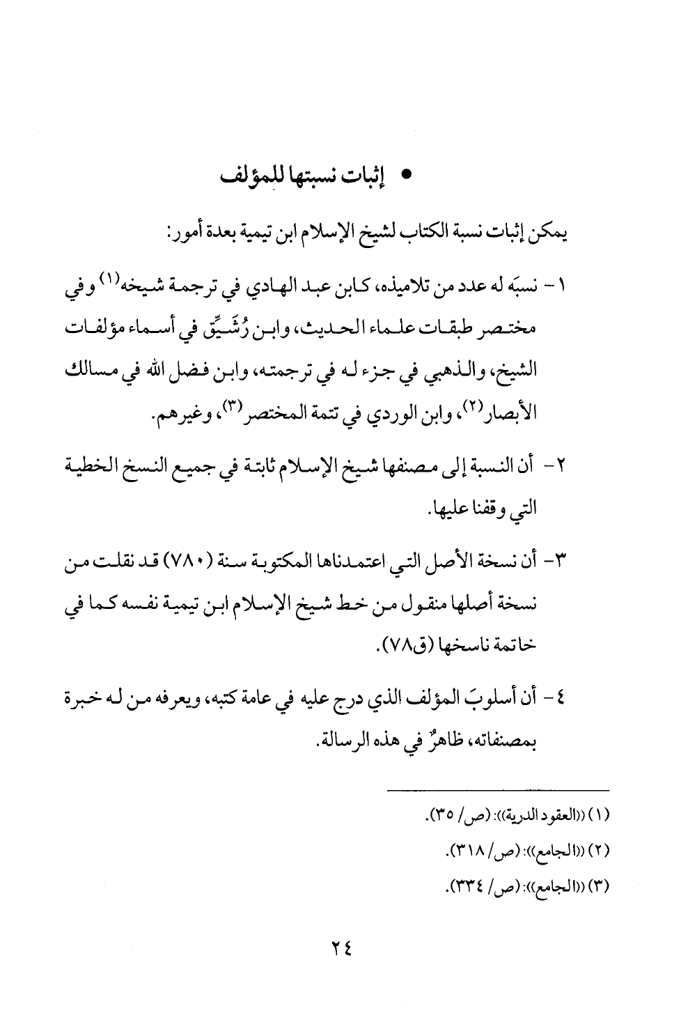 2 - أن النسبة إ لى مصنفها شيخ الاسلام ثابتة في جميع النسخ الخطية