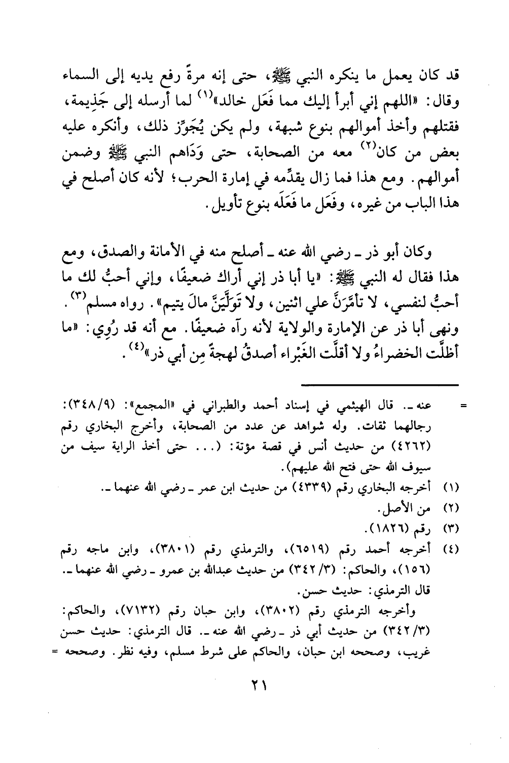 وقال: " اللهم إني أبرأ إليك مما فعل خالد" (1) لما أرسله إلى جذيمة،