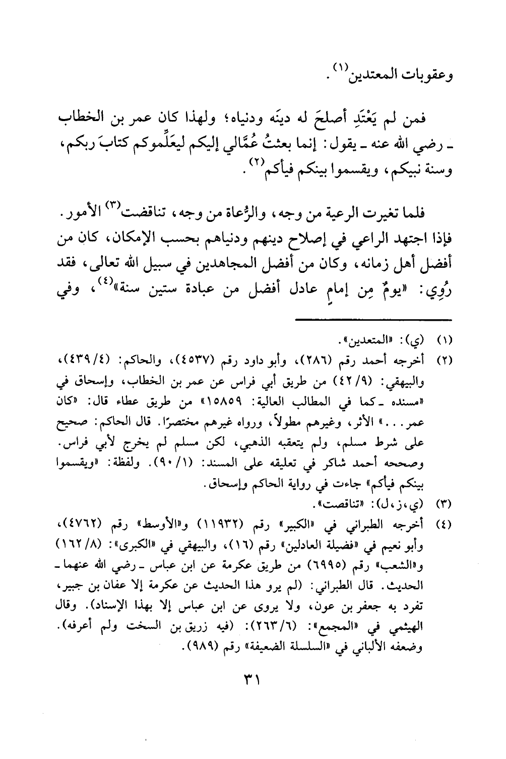 روي: "يوم من إمام عادل أفصل من عبادة ستين سنة" (4)، وفي