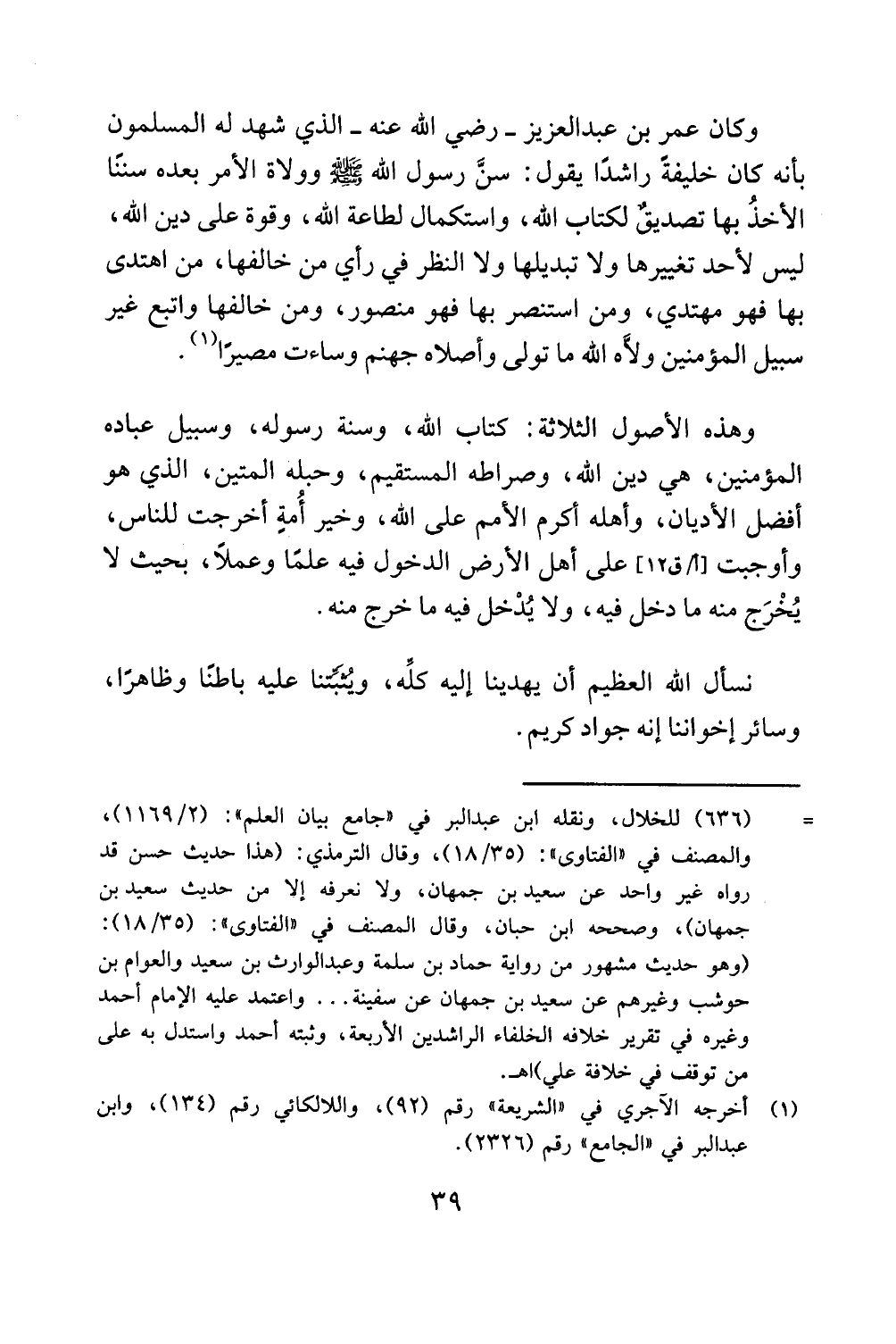 وهذه الاصول الثلاثة: كتاب الله، وسنة وسوله، وسبيل عباده