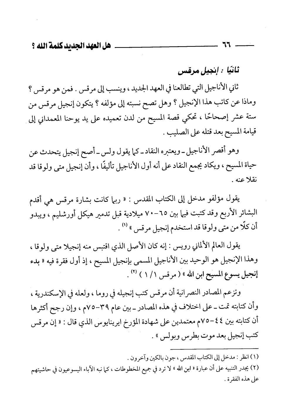 (¬2) يجدر التنبيه على أن عبارة "ابن الله" لا ترد في جميع المخطوطات، كما نبه الآباء اليسوعيون في حاشيتهم على هذه الفقرة.