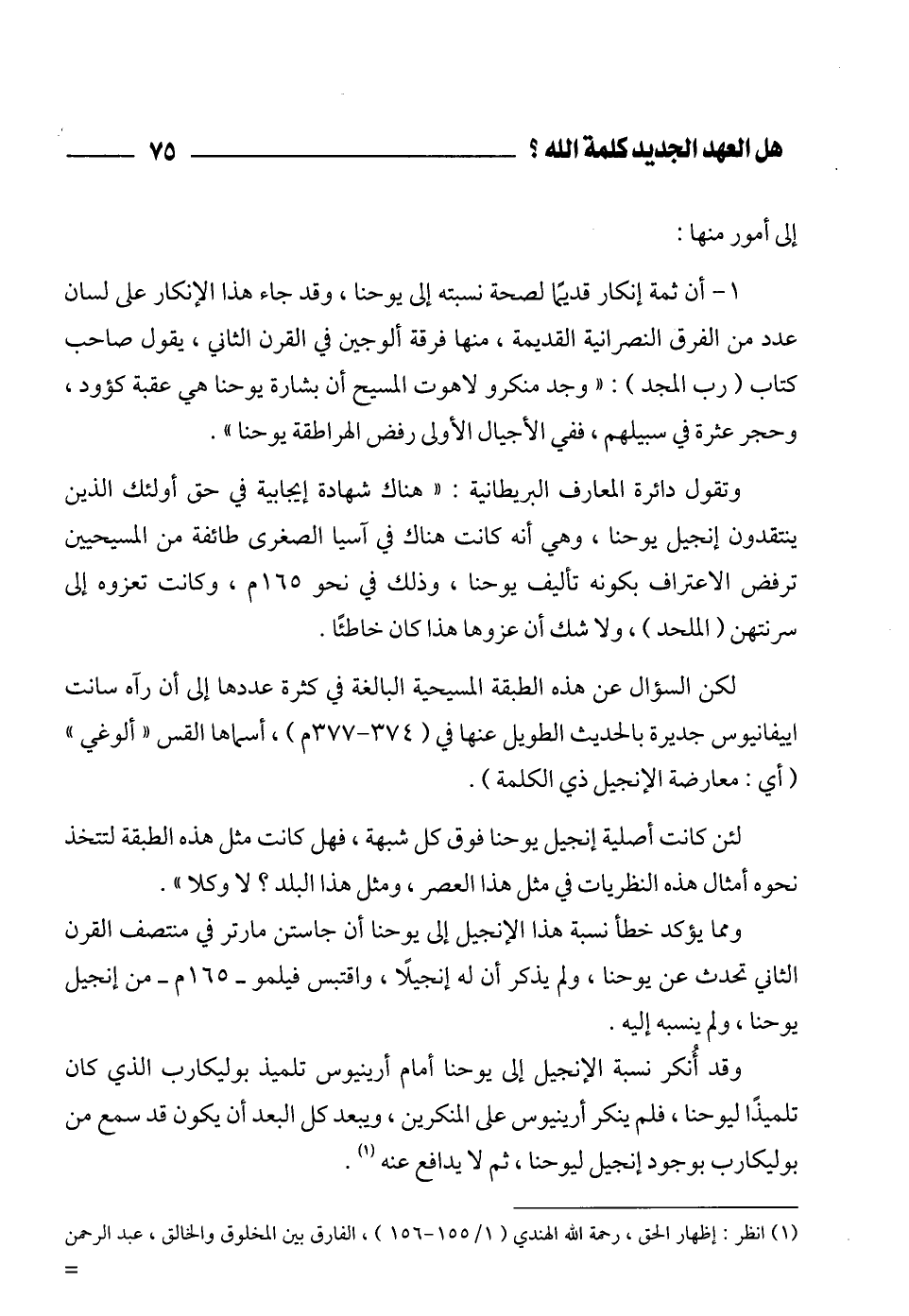 (¬1) انظر: إظهار الحق، رحمة الله الهندي (1/ 155 - 156)، الفارق بين المخلوق والخالق، عبد الرحمن باجي البغدادي، ص (560 - 561).