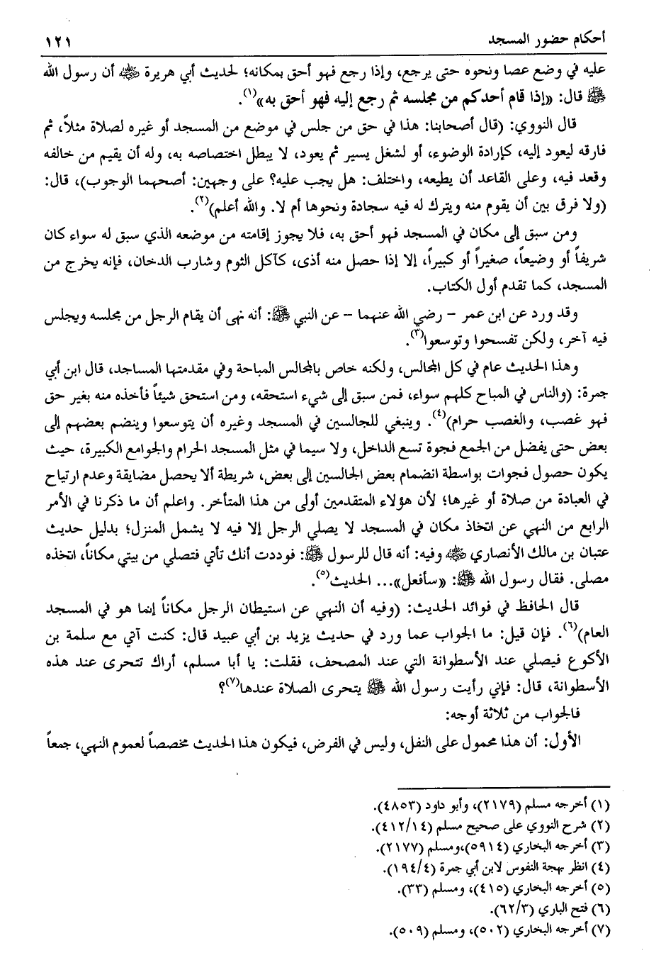 وهذا الحديث عام في كل المجالس، ولكنه خاص بالمجالس المباحة وفي مقدمتها المساجد، قال ابن أبي جمرة: (والناس في المباح كلهم سواء، فمن سبق إلى شيء استحقه، ومن استحق شيئًا فأخذه منه بغير حق فهو غصب، والغصب حرام) (¬4). وينبغي للجالسين في المسجد وغيره أن يتوسعوا وينضم بعضهم إلى بعض حتى يفضل من الجمع فجوة تسع الداخل، ولا سيما في مثل المسجد الحرام والجوامع الكبيرة، حيث يكون حصول فجوات بواسطة انضمام بعض الجالسين إلى بعض، شريطة ألا يحصل مضايقة وعدم ارتياح في العبادة من صلاة أو غيرها؛ لأن هؤلاء المتقدمين أولى من هذا المتأخر. واعلم أن ما ذكرنا في الأمر الرابع من النهي عن اتخاذ مكان في المسجد لا يصلي الرجل إلا فيه لا يشمل المنزل؛ بدليل حديث عتبان بن مالك الأنصاري -رضي الله عنه- وفيه: أنه قال للرسول -صَلَّى اللَّهُ عَلَيْهِ وَسَلَّمَ-: فوددت أنك تأتي فتصلي من بيتي مكانًا، اتخذه مصلى. فقال رسول الله -صَلَّى اللَّهُ عَلَيْهِ وَسَلَّمَ-: "سأفعل" ... الحديث (¬5).