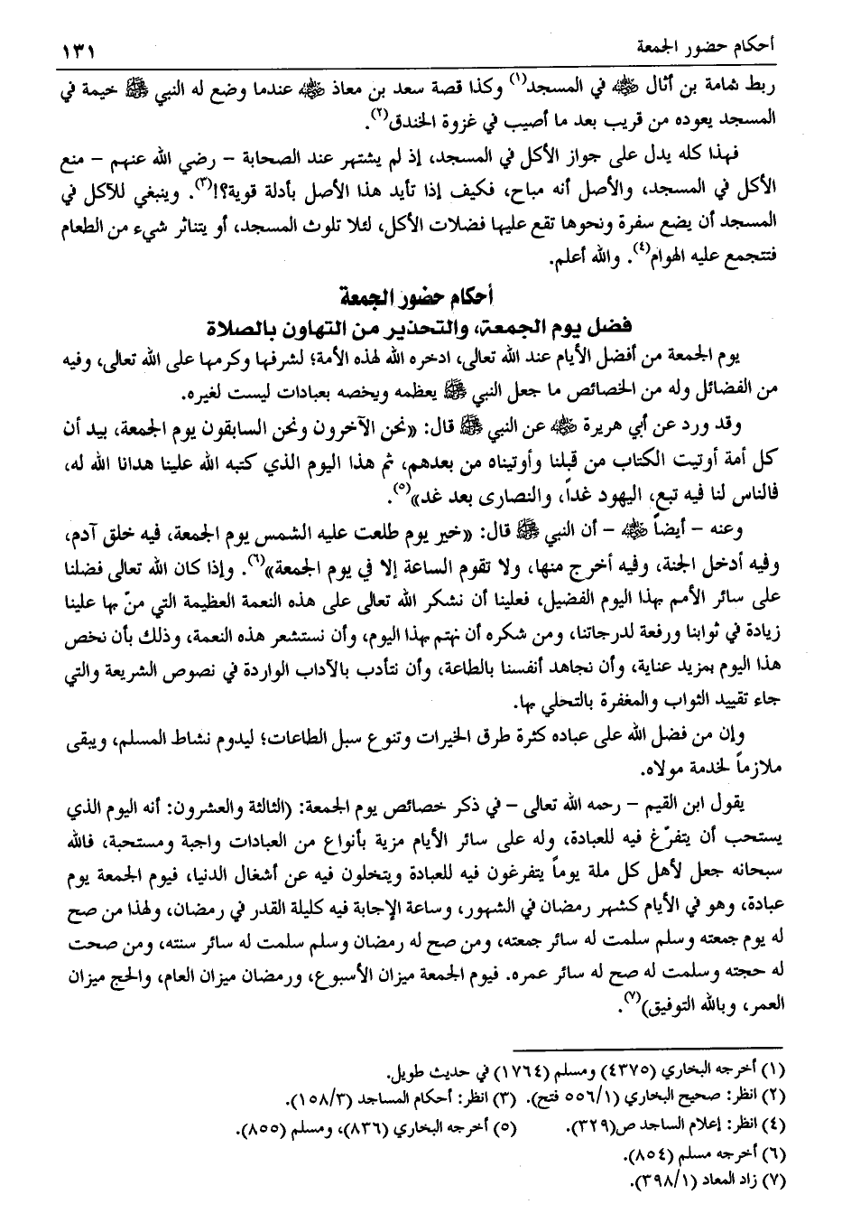 وعنه -أيضًا رضي الله عنه- أن النبي -صَلَّى اللَّهُ عَلَيْهِ وَسَلَّمَ- قال: "خير يوم طلعت عليه الشمس يوم الجمعة، فيه خلق آدم، وفيه أدخل الجنة، وفيه أخرج منها، ولا تقوم الساعة إلا في يوم الجمعة" (¬6). وإذا كان الله تعالى فضلنا على سائر الأمم بهذا اليوم الفضيل، فعلينا أن نشكر الله تعالى على هذه النعمة العظيمة التي منّ بها علينا زيادة في ثوابنا ورفعة لدرجاتنا، ومن شكره أن نهتم بهذا اليوم، وأن نستشعر هذه النعمة، وذلك بأن نخص هذا اليوم بمزيد عناية، وأن نجاهد أنفسنا بالطاعة، وأن نتأدب بالآداب الواردة في نصوص الشريعة والتي جاء تقييد الثواب والمغفرة بالتحلي بها.