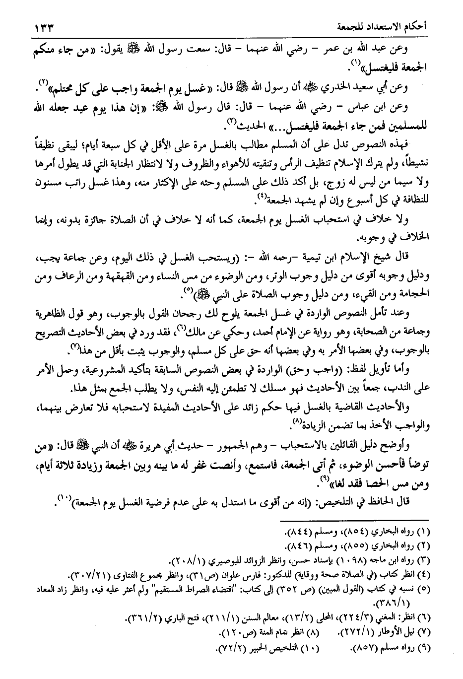 وعند تأمل النصوص الواردة في غسل الجمعة يلوح لك رجحان القول بالوجوب، وهو قول الظاهرية وجماعة من الصحابة، وهو رواية عن الإمام أحمد، وحكى عن مالك (¬6)، فقد ورد في بعض الأحاديث التصريح بالوجوب، وفي بعضها الأمر به وفي بعضها أنه حق على كل مسلم، والوجوب يثبت بأقل من هنا (¬7).