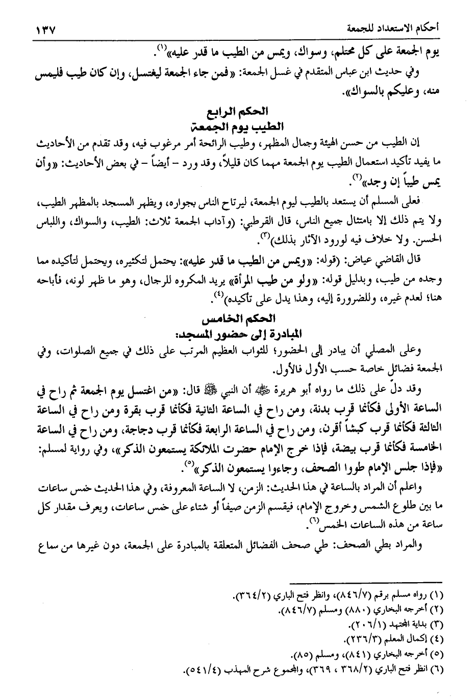 واعلم أن المراد بالساعة في هذا الحديث: الزمن، لا الساعة المعروفة، وفي هذا الحديث خمس ساعات ما بين طلوع الشمس وخروج الإمام، فيقسم الزمن صيفًا أو شتاء على خمس ساعات، ويعرف مقدار كل ساعة من هذه الساعات الخمس (¬6).