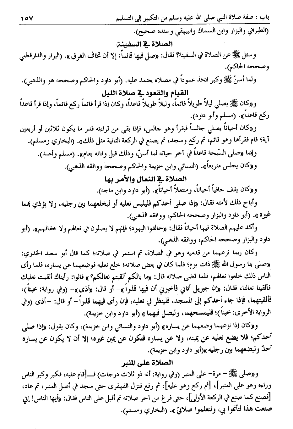 و (كان إذا نزعهما وضعهما عن يساره) وكان يقول: (أبو داود والنسائي وابن خزيمة)، (إذا صلى أحدكم؛ فلا يضع نعليه عن يمينه، ولا عن يساره فتكون عن يمين غيره؛ إلا أن لا يكون عن يساره أحد وليضعهما بين رجليه). (أبو داود وابن خزيمة).