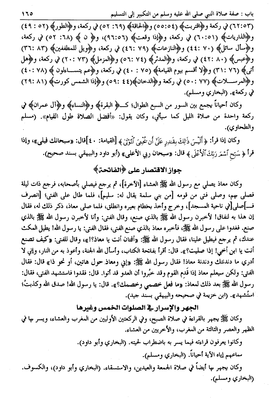 وكان أحيانًا يجمع بين السور من السبع الطوال؛ كـ البقرة والنساء وآل عمران في ركعة واحدة من صلاة الليل كما سيأتي وكان يقول: (أفضل الصلاة طول القيام). (مسلم والطحاوي).