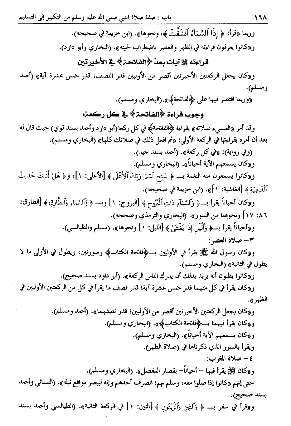 و (كان أحيانًا يقرأ بـ (والسماء ذات البروج) (85: 22) وبـ والسماء والطارق (86: 17) ونحوهما من السور). (البخاري والترمذي وصححه).