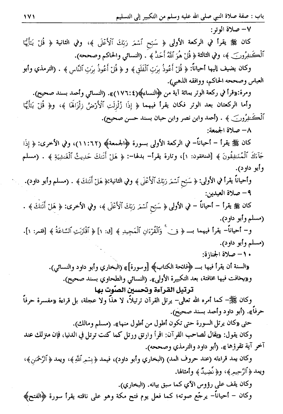 (كان صَلَّى اللَّهُ عَلَيْهِ وَسَلَّمَ يقرأ في الركعة الأولى سبح اسم ربك الأعلى (87: 19)، وفي الثانية قل يا أيها الكافرون (109: 6)، وفي الثالثة قل هو الله أحد (112: 4). (النسائي والحاكم وصححه).