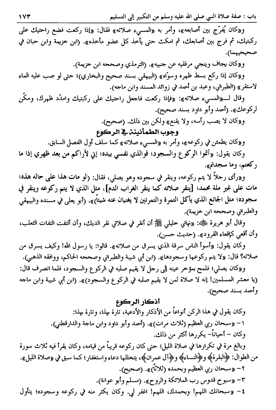 (يا معشر المسلمين إنه لا صلاة لمن لا يقيم صلبه في الركوع والسجود). (ابن أبي شيبة وابن ماجة وأحمد بسند صحيح).