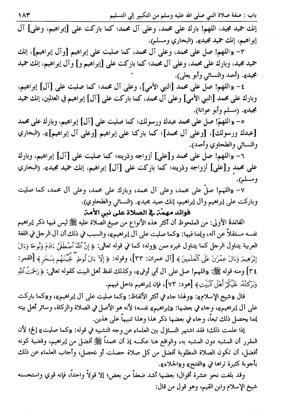قال (شيخ الإسلام): (ولهذا جاء في أكثر الألفاظ: (كما صليت على آل إبراهيم)، و (كما باركت على آل إبراهيم)، وجاء في بعضها: (إبراهيم) نفسه؛ لأنه هو الأصل في الصلاة والزكاة، وسائر أهل بيته إنما يحصل ذلك تبعًا، وجاء في بعضها ذكر هذا وهذا تنبيهًا على هذين).