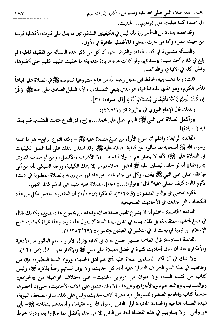 قلت: وما ذهب إليه الحافظ ابن حجر رحمه الله من عدم مشروعية تسويده صَلَّى اللَّهُ عَلَيْهِ وَسَلَّمَ في الصلاة عليه اتباعًا للأمر الكريم، وهو الذي عليه الحنفية؛ هو الذي ينبغي التمسك به؛ لأنه الدليل الصادق على حبه صَلَّى اللَّهُ عَلَيْهِ وَسَلَّمَ، {قل إن كنتم تحبوني فاتبعوني يحببكم الله} [آل عمران: 31].