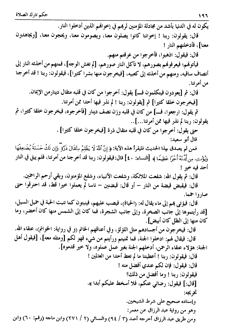 فمن لم يصدق بهذا الحديث فليقرأ هذه الآية: {إن الله لا يظلم مثقال ذرة وإن تك حسنة يضاعفها ويؤت من لدنه أجرًا عظيمًا} [النساء: 40] قال: فيقولون: ربنا قد أخرجنا من أمرتنا فلم يبق في النار أحد فيه خير!