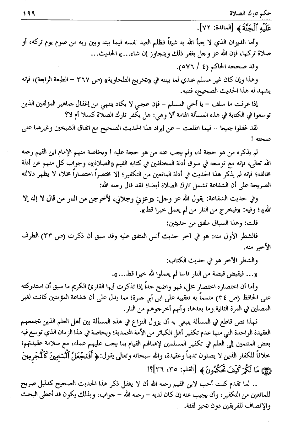 فهذا نص قاطع في المسألة ينبغي به أن يزول به النزاع في هذه المسألة بين أهل العلم الذين تجمعهم العقيدة الواحدة التي منها عدم تكفير أهل الكبائر من الأمة المحمدية؛ وبخاصة في هذا الزمان الذي توسع فيه بعض المنتمين إلى العلم في تكفير المسلمين لإهمالهم القيام بما يجب عليهم عمله، مع سلامة عقيدتهم؛ خلافًا للكفار الذين لا يصلون تدينًا وعقيدة والله سبحانه وتعالى يقول: {أفنجعل المسلمين كالمجرمين (35) ما لكم كيف تحكمون}؟!