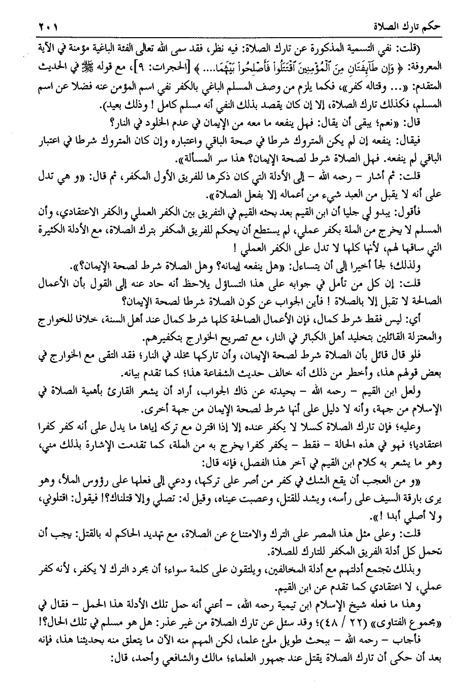 (قلت: نفي التسمية المذكورة عن تارك الصلاة: فيه نظر، فقد سمى الله تعالى الفئة الباغية مؤمنة في الآية المعروفة: {وإن طائفتان من المؤمنين اقتتلوا فأصلحوا بينهما ... } مع قوله صَلَّى اللَّهُ عَلَيْهِ وَسَلَّمَ في الحديث المتقدم: ( ... وقتاله كفر)، فكما لم يلزم من وصف المسلم الباغي بالكفر نفي اسم المؤمن عنه فضلًا عن اسم المسلم فكذلك تارك الصلاة، إلا إن كان يقصد بذلك النفي أنه مسلم كامل! وذلك بعيد).