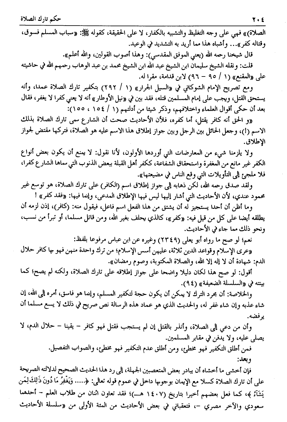 ولقد صدق رحمه الله، لكن ذهابه إلى جواز إطلاق اسم (الكافر) على تارك الصلاة، هو توسع غير محمود عندي، لأن الأحاديث التي أشار إليها ليس فيها الإطلاق المدعى، وإنما فيها: (فقد كفر)!