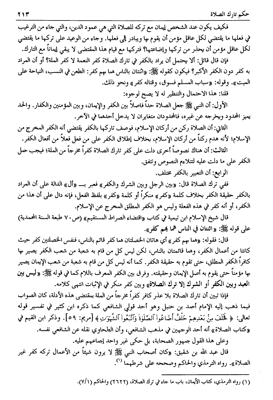 (¬1) رواه الترمذي، كتاب الأيمان، باب ما جاء في ترك الصلاة، (2622) والحاكم (1/ 7).