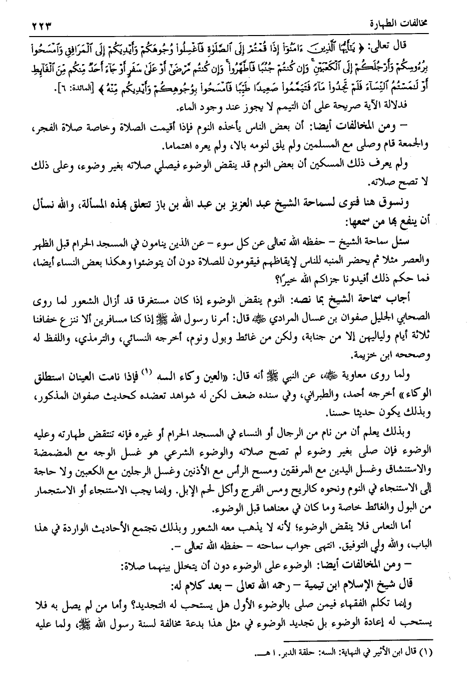 وبذلك يعلم أن من نام من الرجال أو النساء في المسجد الحرام أو غيره فإنه تنتقض طهارته وعليه الوضوء فإن صلى بغير وضوء لم تصح صلاته والوضوء الشرعي هو غسل الوجه مع المضمضة والإستنشاق وغسل اليدين مع المرفقين ومسح الرأس مع الأذنين وغسل الرجلين مع الكعبين ولا حاجة إلى الإستنجاء في النوم ونحوه كالريح ومس الفرج وأكل لحم الإبل. وإنما يجب الإستنجاء أو الإستجمار من البول والغائط خاصة وما كان في معناهما قبل الوضوء.