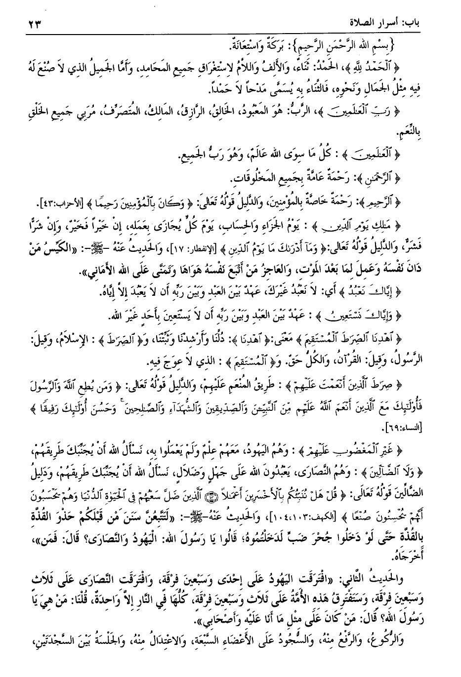 (اهدنا الصراط المستقيم) معنى "اهدنا" دلنا وأرشدنا وثبتنا، و"الصراط" الإسلام، وقيل: الرسول، وقيل: القرآن، والكل حق. و"المستقيم" الذي لا عوج فيه.