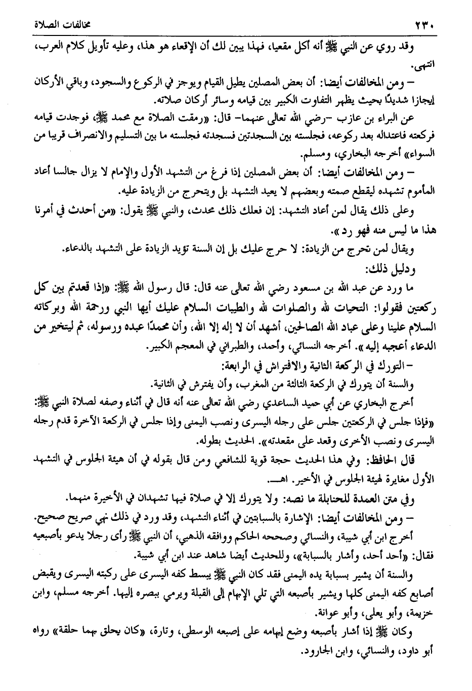 - ومن المخالفات أيضًا: الإشارة بالسبابتين في أثناء التشهد، وقد ورد في ذلك نهي صريح صحيح.