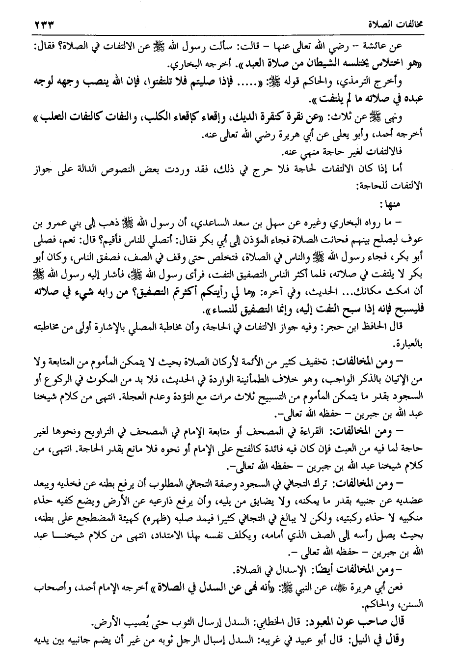 - ومن المخالفات: ترك التجافي في السجود وصفة التجافي المطلوب أن يرفع بطنه عن فخذيه ويبعد عضديه عن جنبيه بقدر ما يمكنه، ولا يضايق من يليه، وأن يرفع ذارعيه عن الأرض ويضع كفيه حذاء منكبيه لا حذاء ركبتيه، ولكن لا يبالغ في التجافي كثيرًا فيمد صلبه (ظهره) كهيئة المضطجع على بطنه، بحيث يصل رأسه إلى الصف الذي أمامه، ويكلف نفسه بهذا الامتداد، انتهى من كلام شيخنا عبد الله بن جبرين -حفظه الله تعالى-.